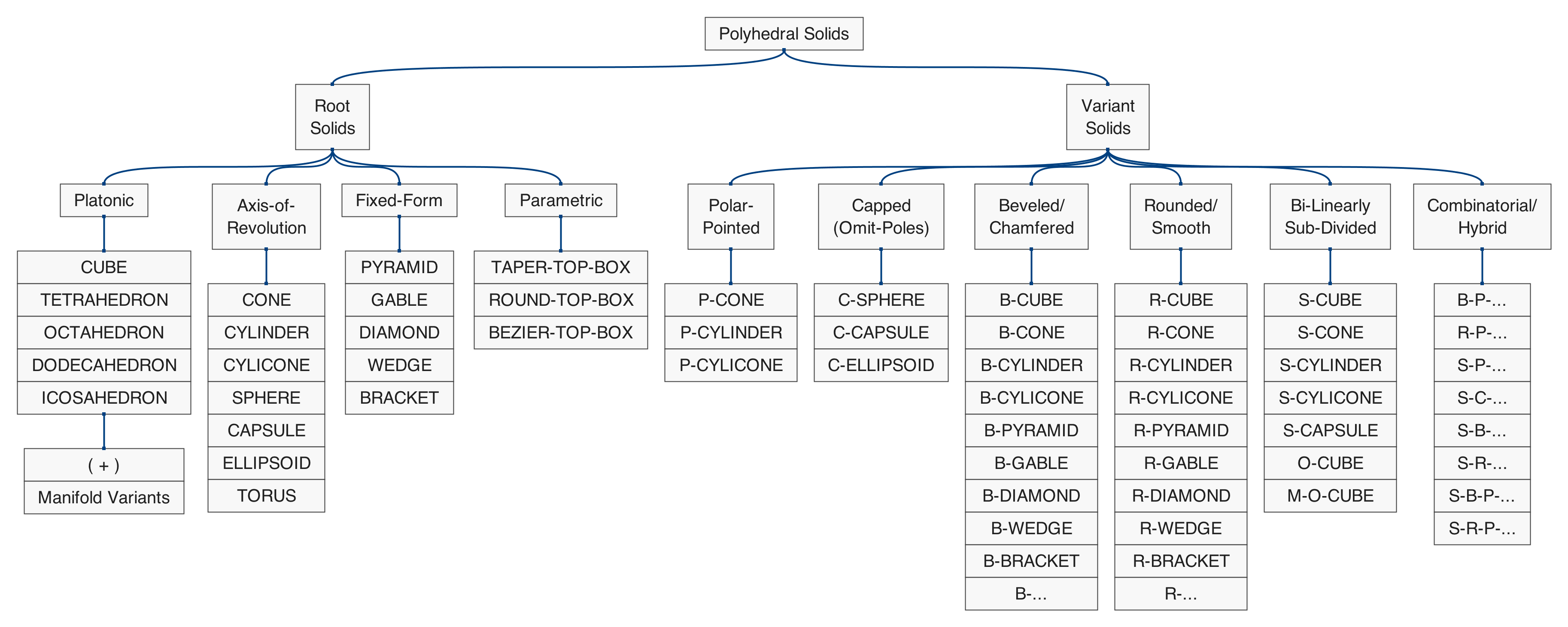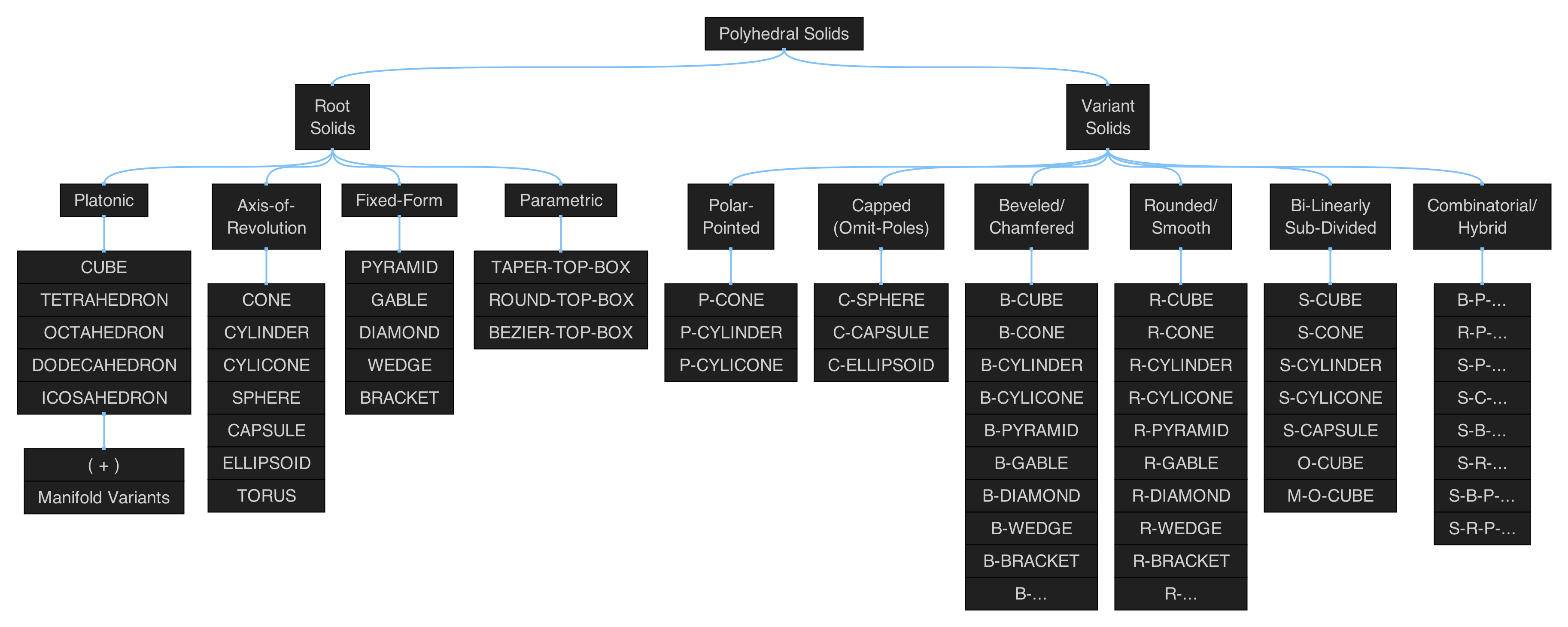 Topology Types:→ [ triangles ]Vertex Count:→ |V| = 2 * ( 4 ^ sub_division_iterations ) + 2Polygon Count:→ |P| = 4 * ( 4 ^ sub_division_iterations )Practical Examples:return tetrasphere();
